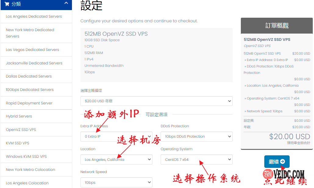 3、进入产品配置页面(可先将语言设置成中文),可以进行购买额外IP、增加DDoS防御、选择机房和操作系统等操作,如果不想操作直接默认操作即可,设置完成后点击“继续”按钮: