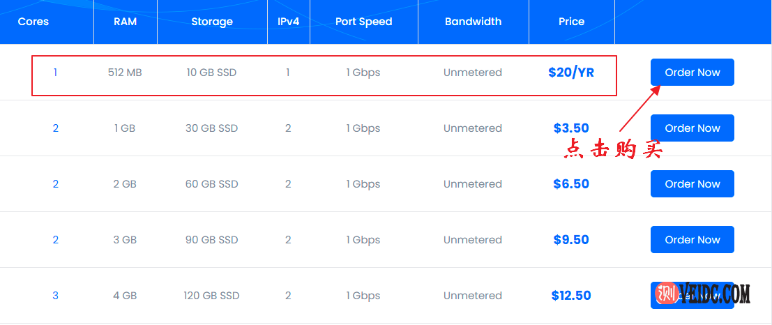 2、点击进入DediPath SSD VPS方案列表,选择适合自己配置的VPS方案,这里以购买年付20美元/年的方案为例,点击方案后面的“Order Now”按钮,如下图所示: