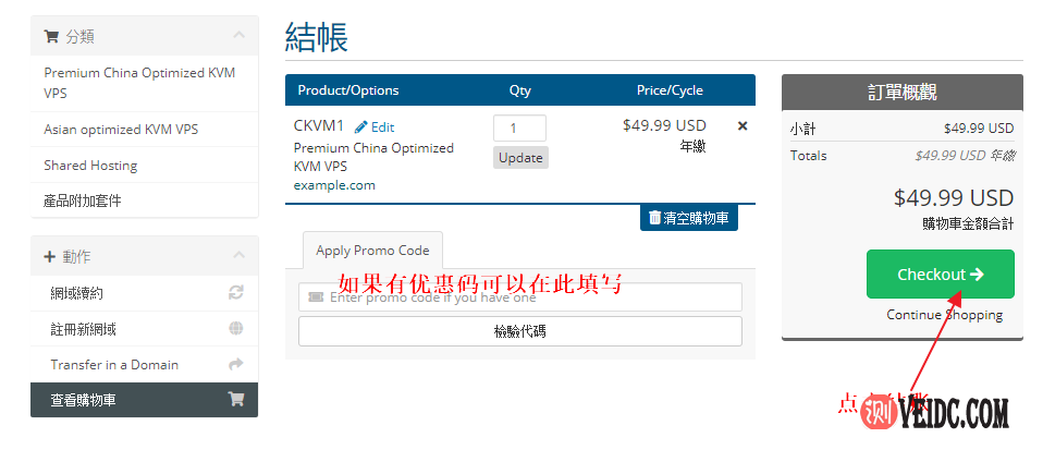 4、进入结账页面,如果有优惠码可以输入优惠,弄好之后点击“Checkout”按钮,如下图所示: