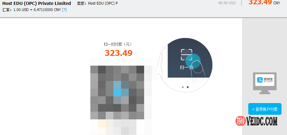 6、最后进入支付宝付款接码,直接使用支付宝扫描付款即可,支付成功之后进入HostDare管理后台,在产品方案列表就可以看到刚刚购买的VPS主机,这样购买过程也就完成了。