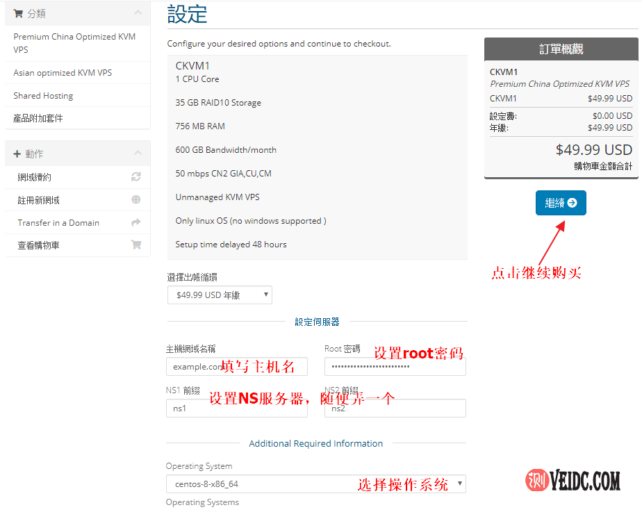 3、进入产品详细配置页面(可以先切换成中文界面),核对产品方案配置参数之后,安装下面文字说明填写好相应的字段,最后点击“继续”按钮即可: