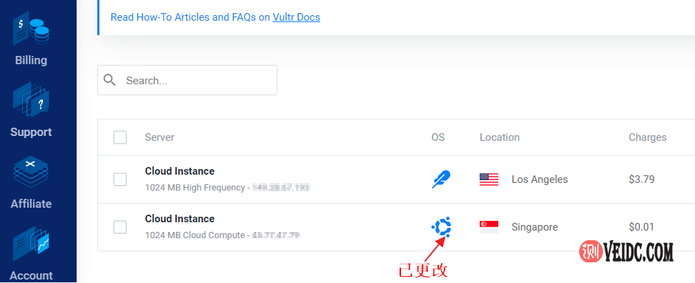 1、首先进入Vultr官网,使用账号和密码登录之后进入后台管理面板,然后选择想要更改操作系统的云服务器方案,如下图所示: