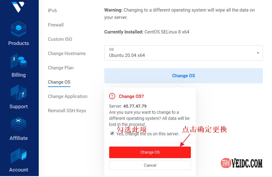 注意事项:①、重装操作系统IP地址并不会发生改变;②、重装操作系统数据会全部清空格式化,所以如果有什么重要数据,务必在重装系统之前进行备份好;③、Change OS(重装系统)和Reinstall Server(重抓服务器)的概念要分别清楚。