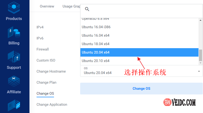 3、进入操作系统选择页面,在下拉列表中选择自己想要更换的操作系统,目前Vultr云服务器支持CentOS、Ubuntu、Debian、Fedora等主流操作系统。小编之前用的是CentOS8系统,现在更改为Ubuntu 20.04系统: