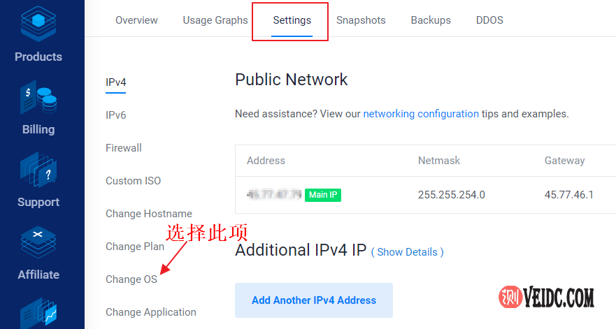 2、进入云服务器方案详细配置页面之后,在Setting主菜单栏下选择“Change OS”选项,如下图所示: