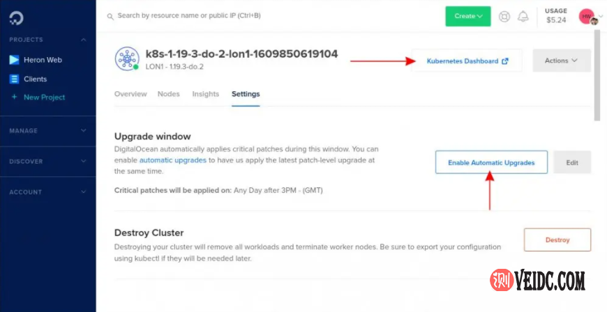 DigitalOcean还提供自动群集升级。点击屏幕顶部的“设置”标签。接下来,按“启用自动升级”。单击“编辑”按钮以自定义可接受的更新时间范围。