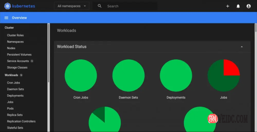 DigitalOcean云服务器内置了对Kubernetes仪表板(Kubernetes项目的官方Web UI)的支持。单击右上角的“ Kubernetes仪表板”按钮以在新选项卡中启动该应用程序。将使用有效的身份验证令牌对其进行预配置。