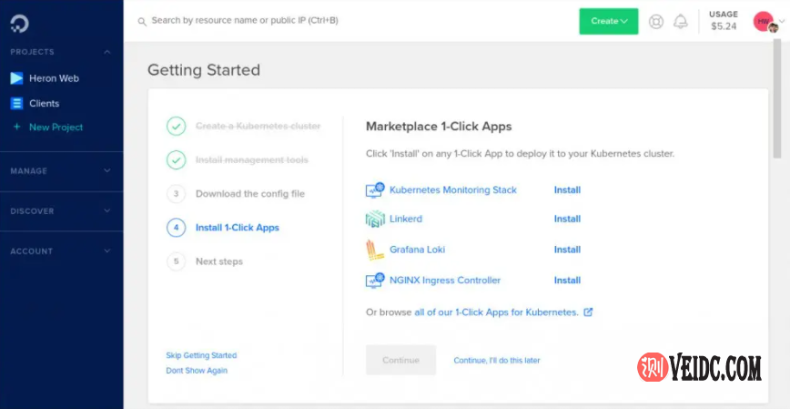 最后一个阶段使可以从DigitalOcean Marketplace快速安装“一键式应用程序”。这些是常用服务(例如NGINX Ingress Controller和Linkerd)的预配置部署。单击任何应用程序旁边的“安装”以添加到您的集群。该过程可能需要几分钟才能完成。