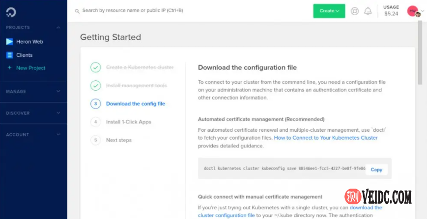 使用此方法时,请注意认证证书将在一周后过期。到期后需要重新下载它。另一种方法是doctl获取配置文件并配置自动证书管理–使用“自动证书管理”下显示的命令进行设置。