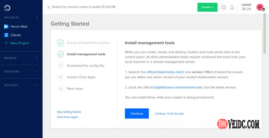 等待期间,可以单击页面顶部显示的“入门”指南。这将引导您完成下载kubectl,Kubernetes官方命令行客户端和doctl,即DigitalOcean自己的客户端。
