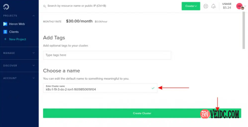添加完节点后,向下滚动页面并为集群命名。单击“创建集群”按钮开始配置过程。这最多需要五分钟才能完成。