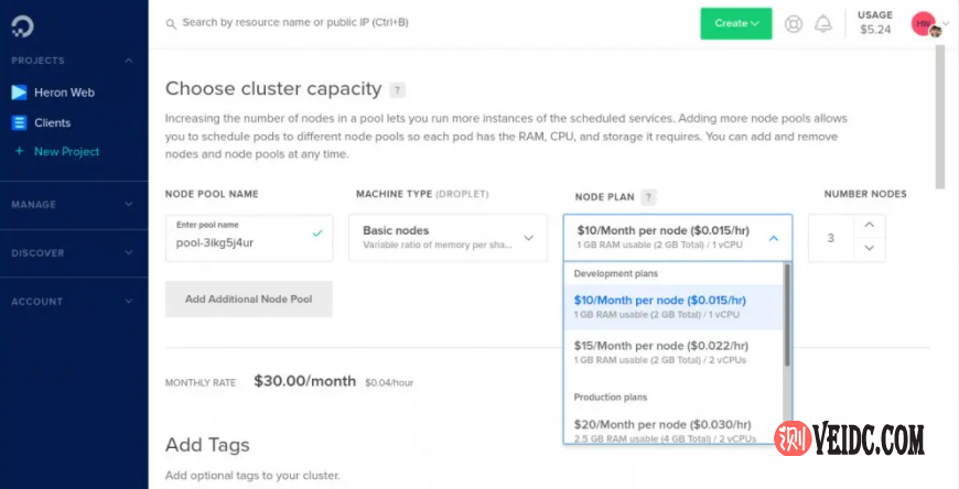 从“Node Plan”下拉列表中选择要使用的液滴类型。为了节省成本,这里使用了最小的选项– 1个vCPU和1GB RAM,每个节点每月10美元。DigitalOcean将此标记为“development plan”,因为可用资源不太可能用于长期生产。