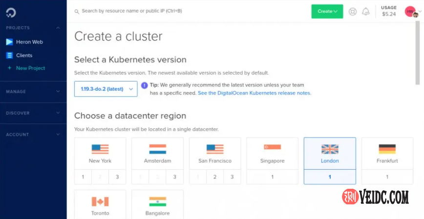接下来,选择一个DigitalOcean数据中心以包含群集的资源,建议选择在地理位置比较靠近网站访客的机房,这样访问速度相对会快一些。