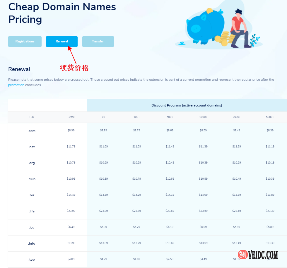 NameSilo续费价格可以在NameSilo官网价格页面进行查看,其中Renewal就是续费价格,NameSilo续费价格基本上常年都是一样的,并不会涨价: