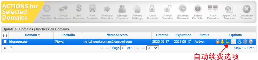 所以,如果嫌续费麻烦,可以将NameSilo设置成自动续费,这样就不会怕域名过期了。设置自动续费也很简单,在域名管理界面,如下图所示,绿色箭头表示开启自动续费,灰色箭头表示关闭自动续费: