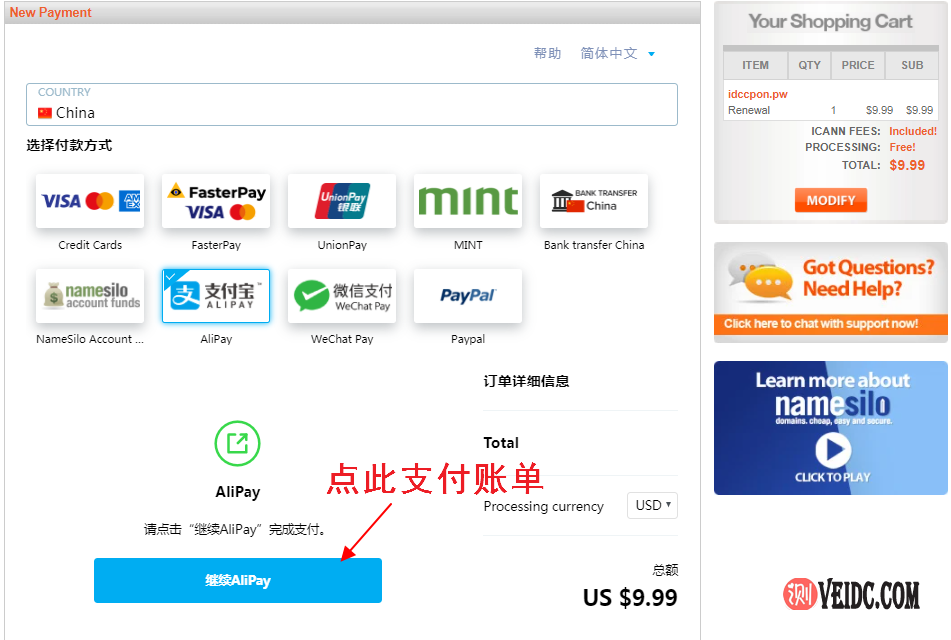 3、最后支付账单即可,支持支付宝付款,这样就完成NameSilo域名的续费过程。目前NameSilo支持最高10年的续费时长。