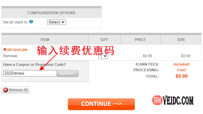 2、在账单配置页面,如果有NameSilo续费优惠码可以在“Have a Coupon or Promotion Code?”输入框中输入优惠码,输入好之后点击“CONTINUE”按钮: