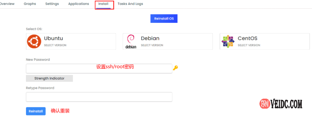 5、点击上图的Install选项就可以重装操作系统,当前Pacificrack主机商提供Ubuntu、CentOS和Debian三种系统供用户选择,大家可以选择合适的系统进行安装即可: