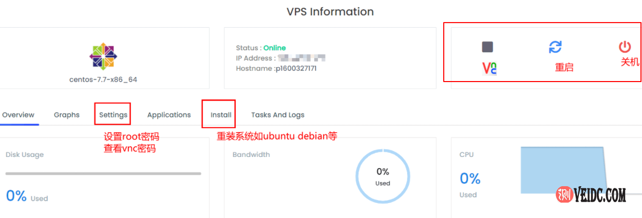 4、点击VPS方案进入管理页面,这时候可以看到基本配置信息,例如IP地址,磁盘空间,流量带宽使用情况,页面右上角还有开启,重启,关闭等功能按钮,具体如下图所示:
