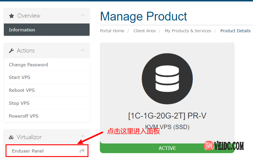 2、进入VPS方案配置页面,在左下角点击“Enduser Panel”选项,这样进入VPS主机控制面板,具体如下图所示: