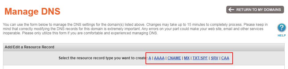 6、以上是关于Namesilo域名的A记录和WWW记录解析方法,如果需要设置MX、CNAME、AAAA、TXT/SPF记录的话,可以点击下图中对应的选项即可,解析方法和A记录解析是一样的: