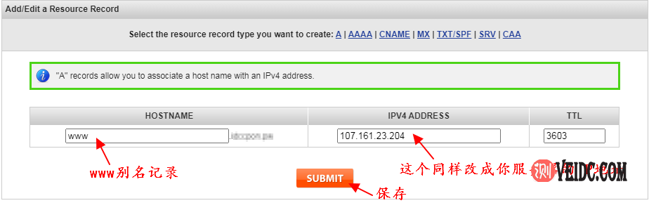 5、如果需要www访问的话,可以对第二条记录进行编辑,其它的和上面设置一样,就是将”HOSTNAME”下方填写www即可: