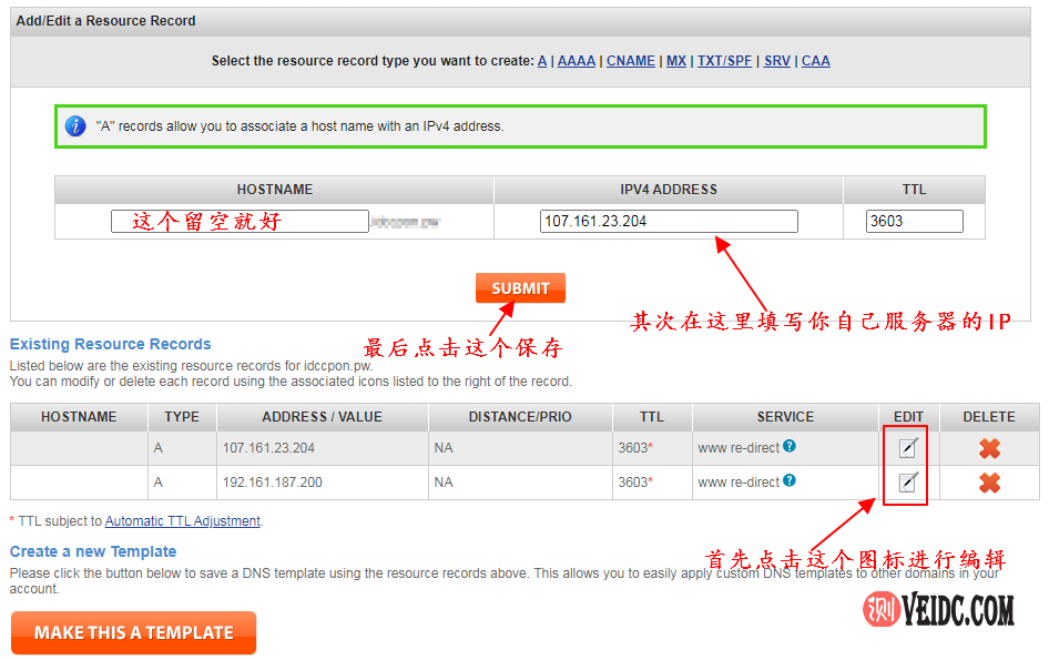 4、删除之后还是剩下两条记录,可以对其进行重新编辑设置,点击后面的小毛笔图标即可编辑,这样解析到你自己的空间IP即可,如下图所示: