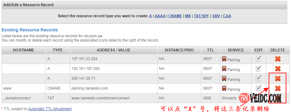 3、对于新注册的域名,Namesilo官方默认都将域名解析到他们自己的官网,总共有五个解析记录,可以删除其中的三个记录,具体如下图所示: