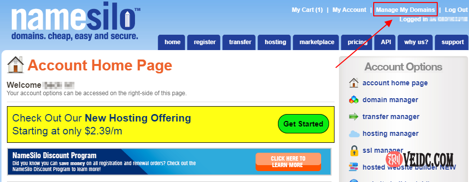 1、首先登陆Namesilo后台,然后点击页面右上角“Manage My Domains”菜单选项,如下图所示:
