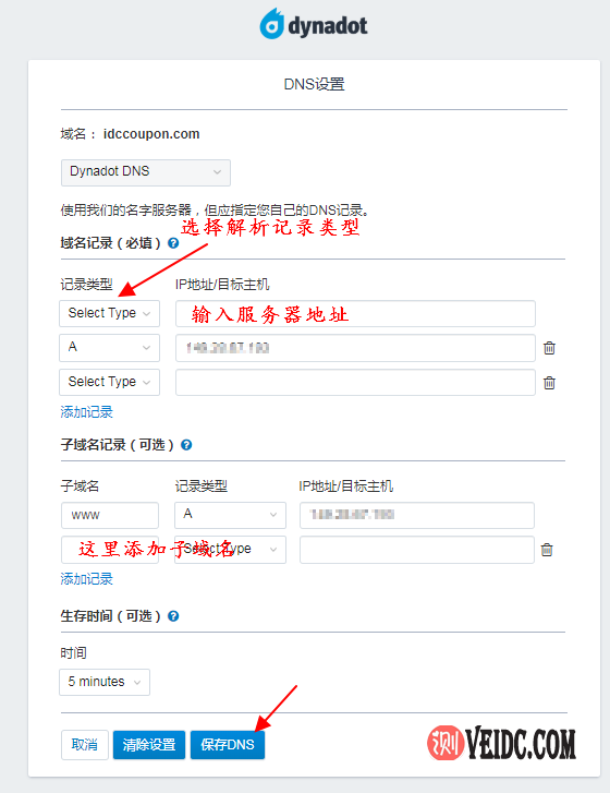 域名解析设置好之后点击“保存DNS”按钮即可,这样所有的设置在你设定的时间内就可以生效。