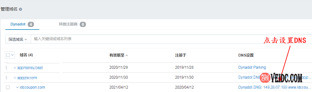 点击“管理域名”菜单选项之后就可以进入到域名管理页面,这里列出你当前所持有的全部域名,然后点击需要解析域名后面的DNS设置选项,具体参看下图所示:
