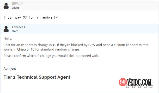 3、Ticket提交完成之后,Virmach客服很快就会回复你,他们会问你更换随机IP还是100%没有被封锁的IP。如果是随机IP需要3美元,如果是100%没有被封锁的IP则需要花费5美元,这个根据自身需求来回复。