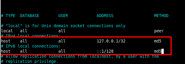 host all all 127.0.0.1/32 md5 host all all ::1/128 md5