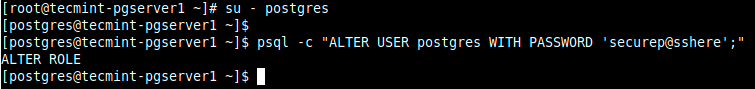 # su - postgres $ psql -c "ALTER USER postgres WITH PASSWORD 'securep@sshere';" $ exit