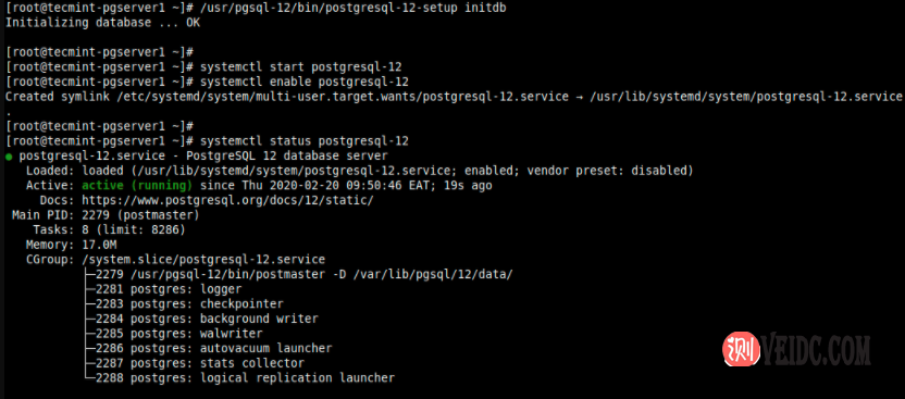 # /usr/pgsql-12/bin/postgresql-12-setup initdb # systemctl start postgresql-12 # systemctl enable postgresql-12 # systemctl status postgresql-12 # systemctl is-enabled postgresql-12