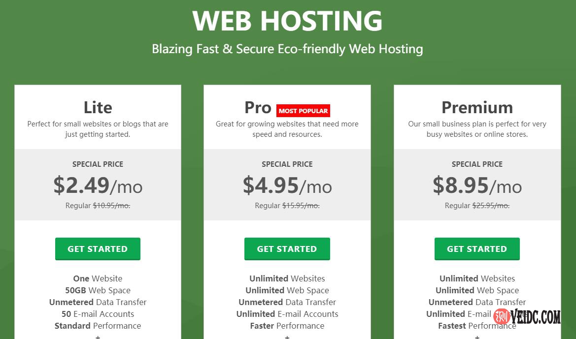 GreenGeeks的虚拟主机价格确实比较的便宜,分为Lite、Pro、Premium三个套餐,主要的区别在于建站个数和分配的服务器资源上的不同。其实最主要的就是建站个数,服务器资源这个稍微有点虚,不必太在于这个。