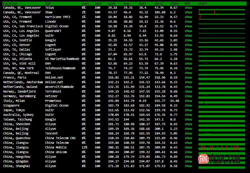 | 全网 | 美国内华达州拉斯维加斯(buyvm.net) 0.4ms/江苏南通(移动) 2061.3ms | 159.6ms |