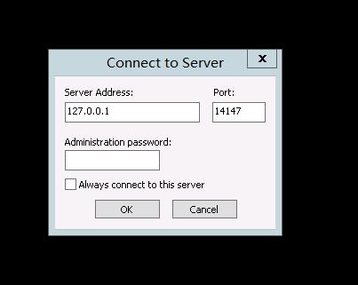 启动FileZilla Server,出现一个配置IP、管理端口的对话框,这里输入本地IP(即127.0.0.1),并且输入之前配置的管理端口(本例为14147),点击【OK】: