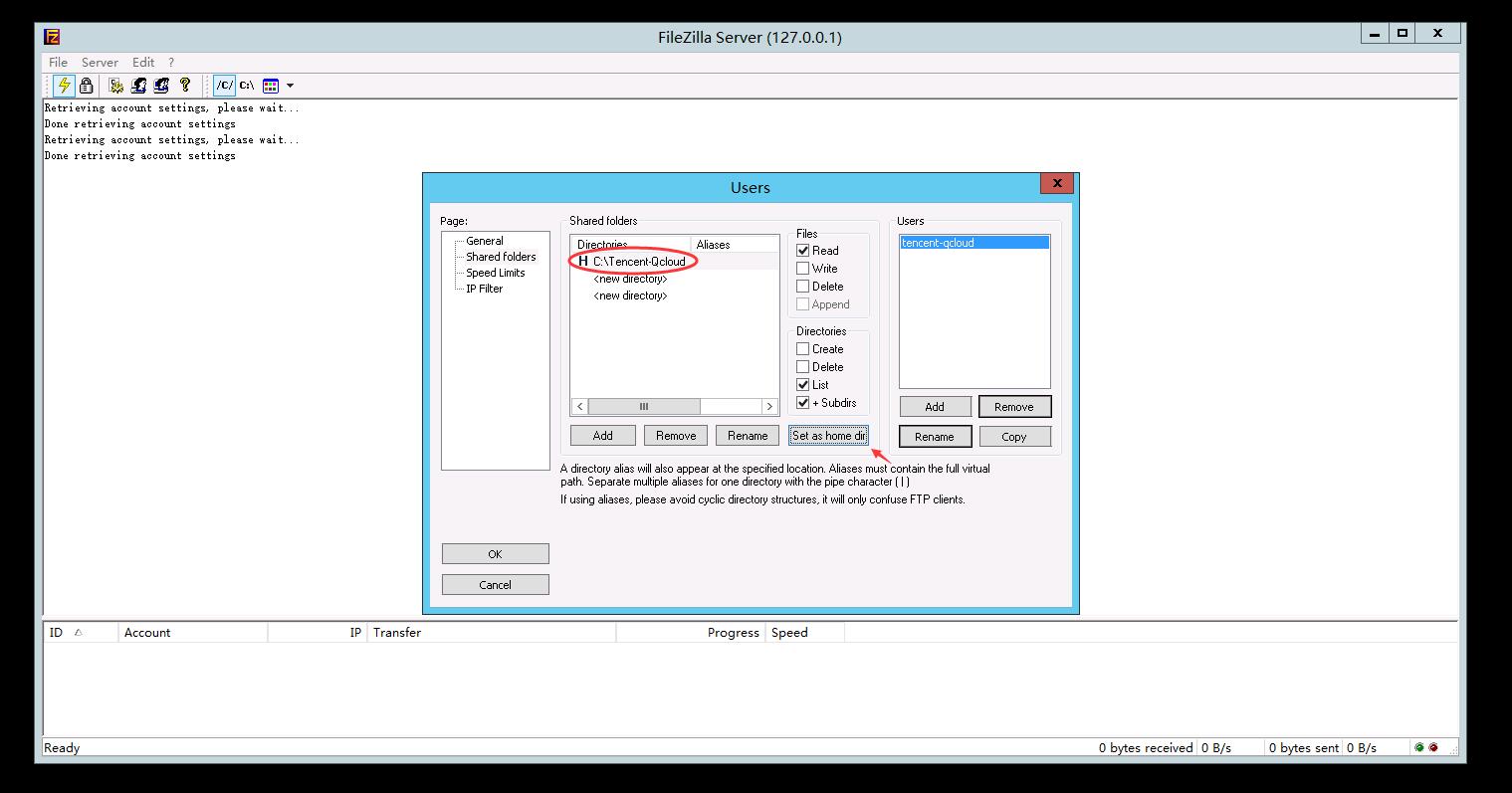 对于每一个资源目录,选中能访问该目录的用户并配置相关的访问权限(请删除Shared Folders下面的New directory项,否则可能报错)。至此,FileZilla服务已经搭建好。
