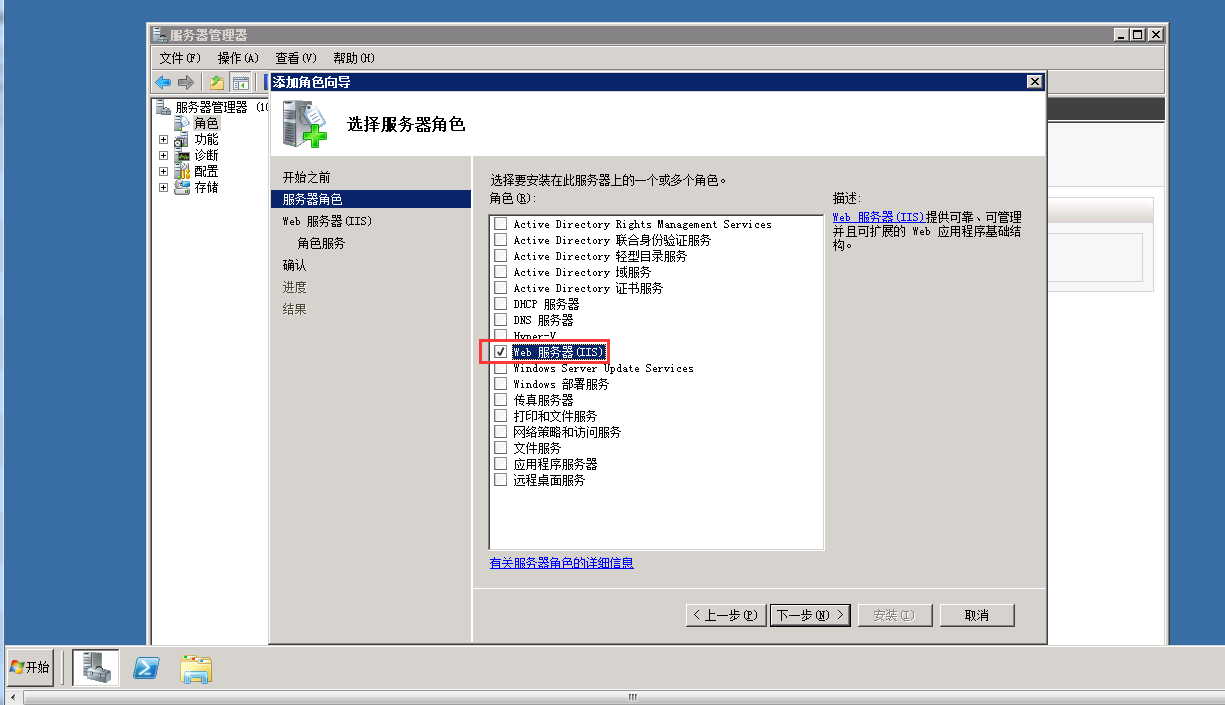 选择【服务器角色】-【Web服务器(IIS)】。