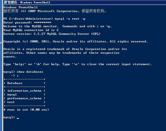 通过设置的root密码在命令行下登录MySQL: