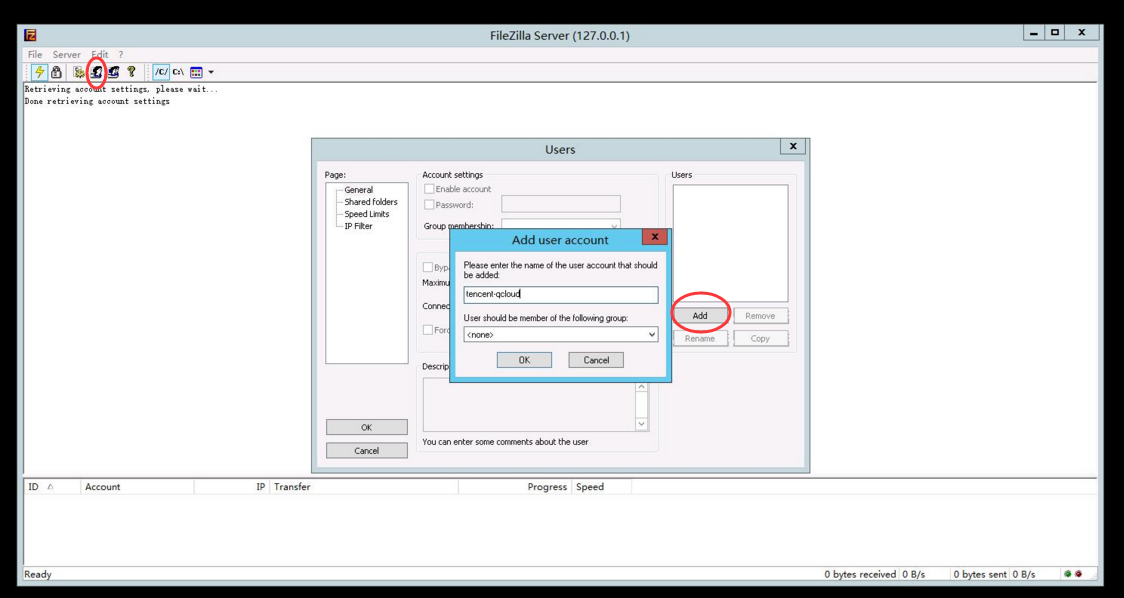 点击工具栏上的user按钮小图标,进入用户配置界面;点击【Add】按钮新增用户;在弹出的对话框中输入用户名(本例测试用户名为tencent-qcloud),点击【OK】进入下一步:
