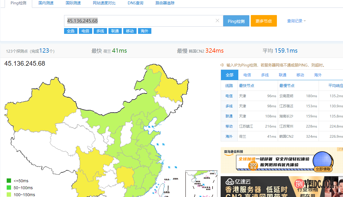 全国PING平均160MS左右,PING值也很稳定,表现还不错。