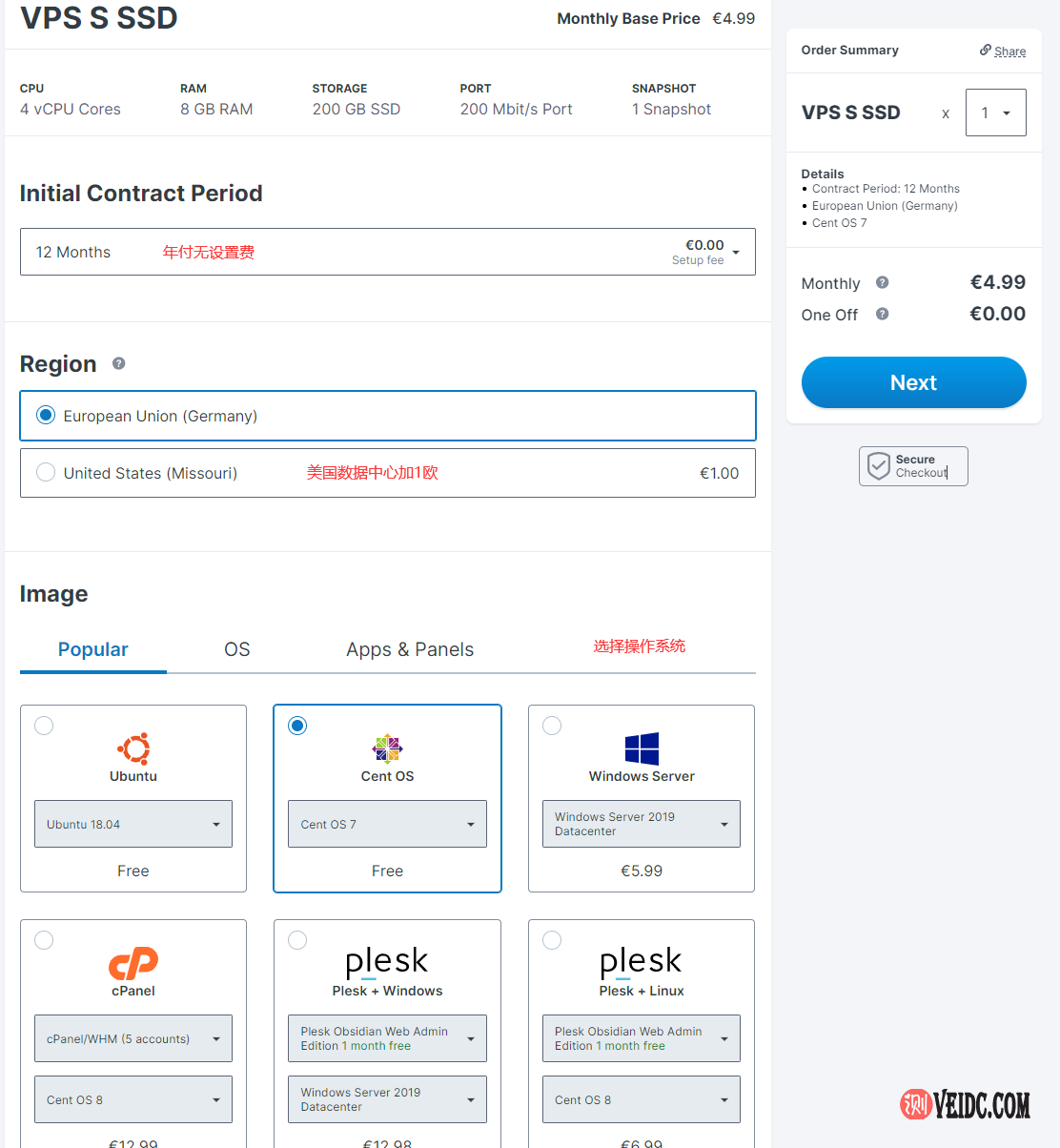 下面二款是Contabo最具性价比的入门级VPS,前者为高性能的SSD磁盘VPS,后者为针对存储优化的HDD磁盘。此外存储VPS数据中心在德国,无法选择美国数据中心。