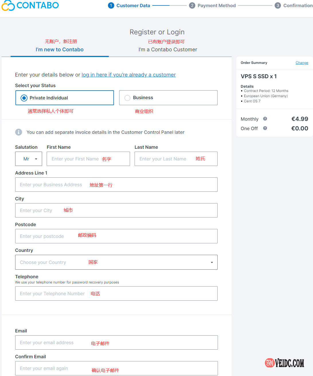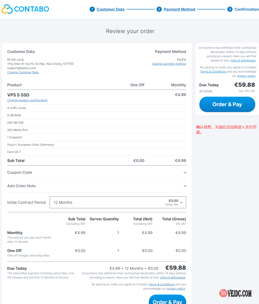 6:因为是为了Contabo改版后做图文教程,因此我没有付款,而是取消返回了页面,到这里就结束了,如果信息无误,将等待开通VPS,注意:德国人一向以严谨著称,购买时尽量不要使用梯子,信息填写不要风马牛不相及,比如你在湖南,你要填写在香港、美国,乱七八糟的填写,大概率要被重审订单。