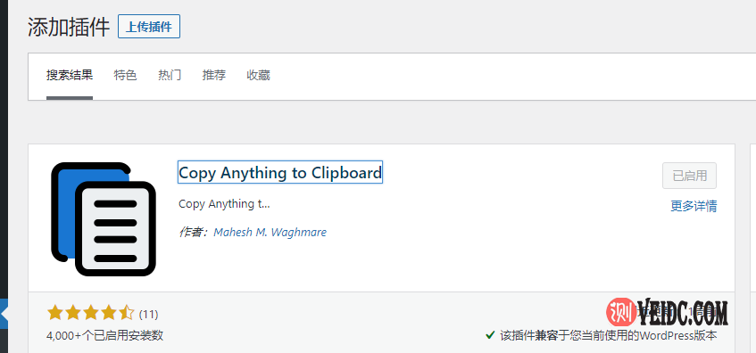1:直接进入WordPress后台,点击插件-安装插件,搜索Copy Anything to Clipboard即可。