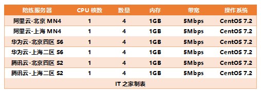 为了保证数据的准确性,我们测试时选取了各家厂商北京和上海两个机房的服务器进行对比测试,同时测试过程中所使用的陪练机也均为与测试机同类型的1核1GB内存,带宽为5Mbps,CentOS 7.2操作系统。