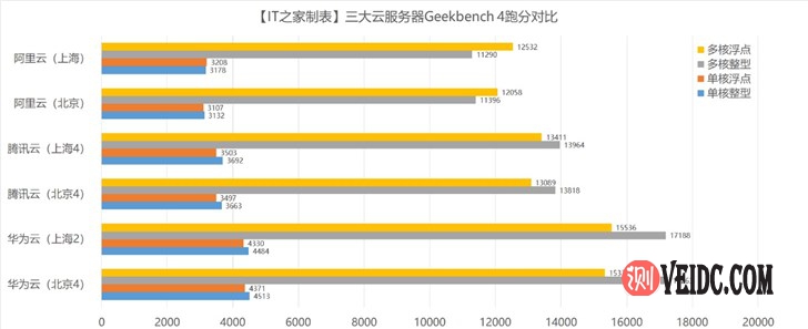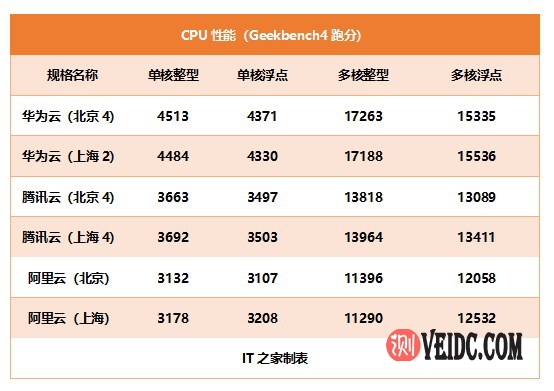 这三款服务器中,腾讯云的具体型号我们无法知晓,但是通过Geekbench 4跑分数据来看,应该是至强E5 269x v4。由于华为云S6采用的架构比较新,所以华为云S6单核和多核跑分明显好于腾讯云S2和阿里云MN4。