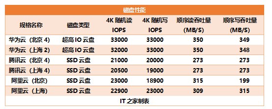 各家虽然命名不同,但是基本的磁盘命名方式我们也能大体了解这些硬盘的一个能力如何,华为云将高速硬盘命名高IO云盘,腾讯云将其命名为高性能云盘,阿里云则称之为高效云盘,这里我们首先来看一下各家高速云盘的表现。