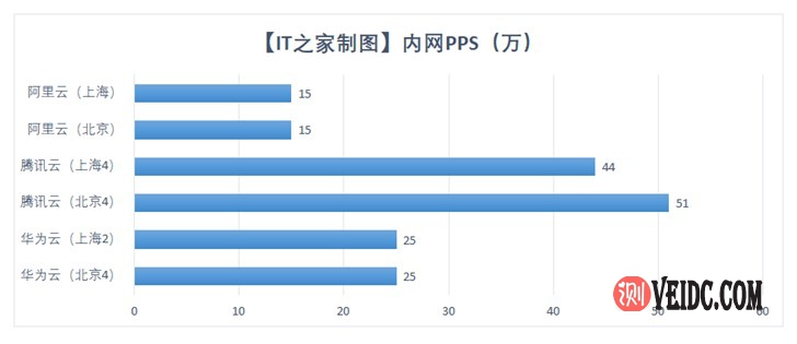 通过测试结果我们看到,华为云S6内网PPS为25万,腾讯云S2内网PPS在45万至51万之间,阿里云MN4内网PPS为15万。整体来看,腾讯云内网数据表现更好一些,不过其他两家的表现也基本上能满足企业用户日常的使用需要。